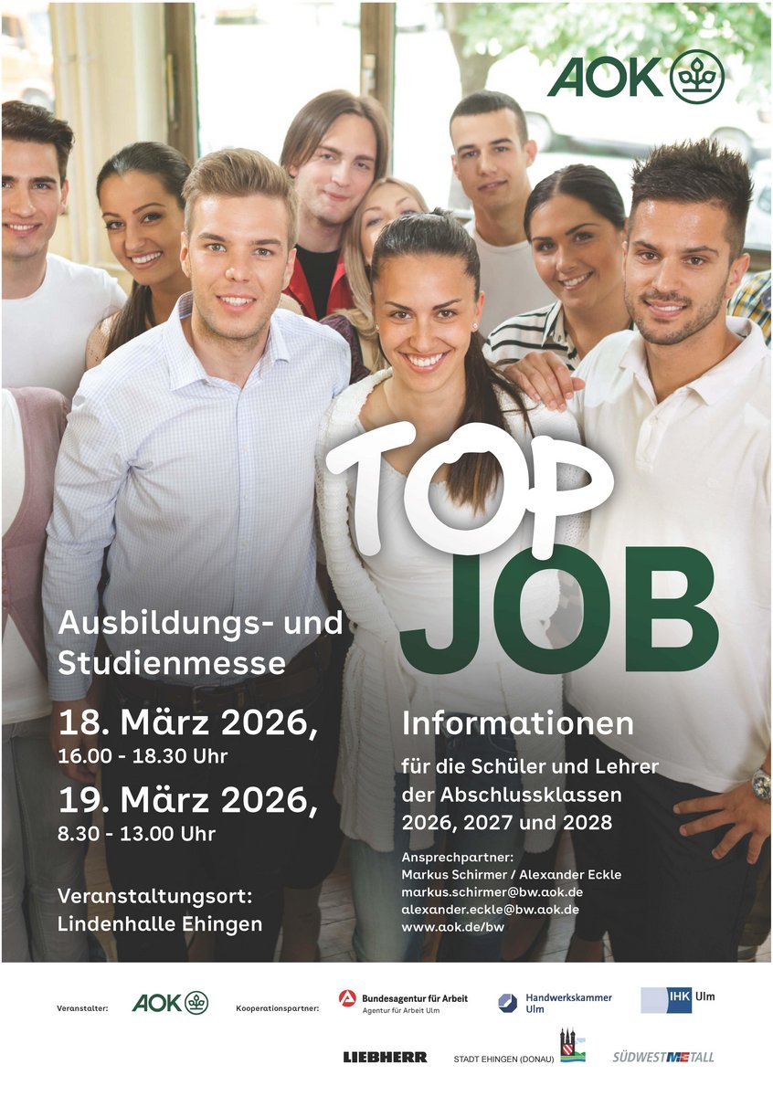 Wir versuchen Abhilfe zu leisten, denn am 18. und 19. März 2026 findet wieder die „TopJob – Ausbildungs- und Studienmesse“ in Ehingen statt.